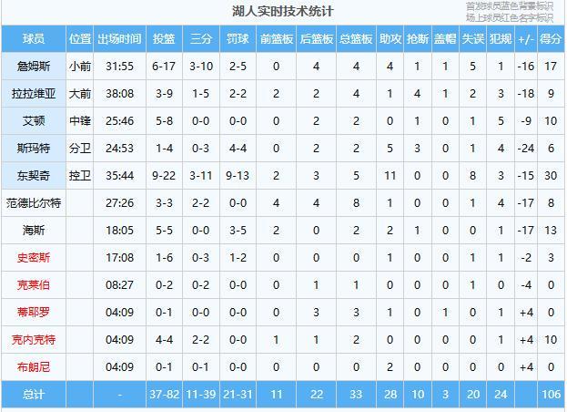 湖人:东契奇30分5板11助、詹姆斯17分4板4助、海斯13分2板2助、艾顿10分2板、克内克特10分2板、拉拉维亚9分4板1助4断、范德比尔特8分8板1助、斯玛特6分2板5助3断